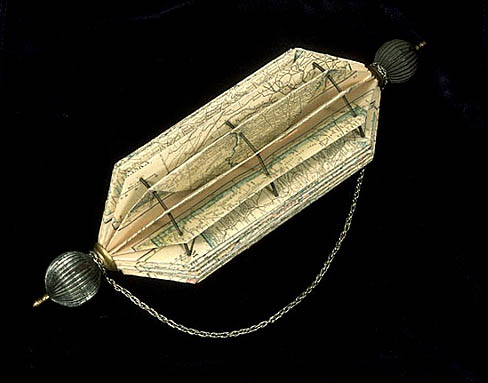 Italio Calvino's memorable book, Invisible Cities, describes fantastic colonies and their inhabitants living in imaginary worlds. His book was an early inspiration, a tribute to an opening or forgotten passage, an adventure into implausible realms. The bookwork I made, with the same title, utilizes an outdated atlas whose pages are folded in on themselves, and alludes to a compact reliquary. Miniature springs separate the pages for the viewer to peer between expanded chapters. As if the piece was fabricated for a sacrament, capping the top and bottom are tarnished finials with an attached chain, reminiscent of a ceremonial object whose purpose has been forgotten. Presented on a blue velvet cloth, the book assumes an elevated importance, as though it might be presented in high court. |