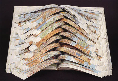 Without severing the spine, the book is cut into one-inch strips. Once the volume, secured from the bottom on a table, is leaned upward, its pages topple into a field of interconnecting waves or “fault lines.” The parallel rows or sections criss-cross in an arbitrary geopolitical braiding that interweaves the beginning and end of the book, allowing the viewer to scrutinize different topographical—and hence editorial—viewpoints and thus to “reread the world” without turning the elongated page shapes of its former mapping.